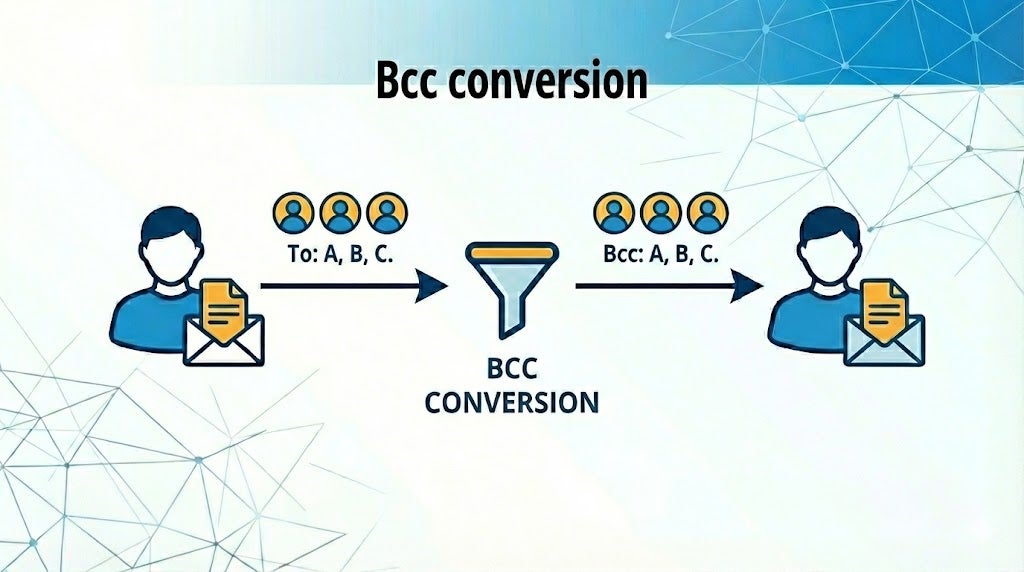 To prevent privacy leaks, the system automatically converts "To" and "Cc" recipients to "Bcc" if the number of recipients exceeds a set threshold.