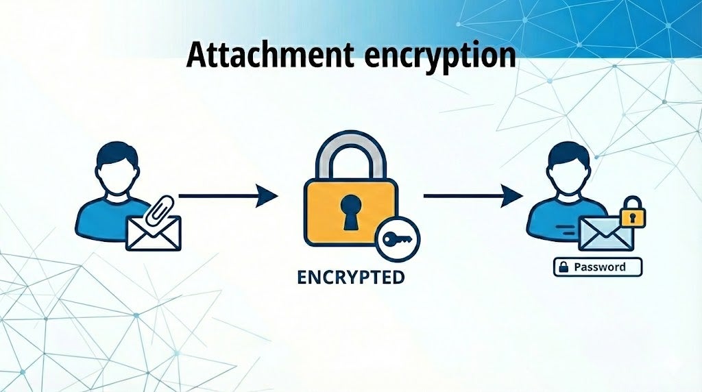 メールに添付されたファイルは自動的にパスワード保護されたZIPファイルに変換されます。パスワードは別途メールで受信者に送信されます。