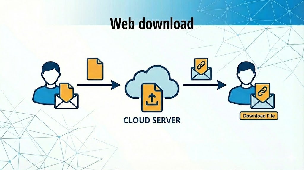 大容量ファイルは自動的にメールから切り離され、安全なウェブサーバーにアップロードされます。受信者は代わりにダウンロードリンクを受け取るため、メールボックスの容量オーバーを防止します。