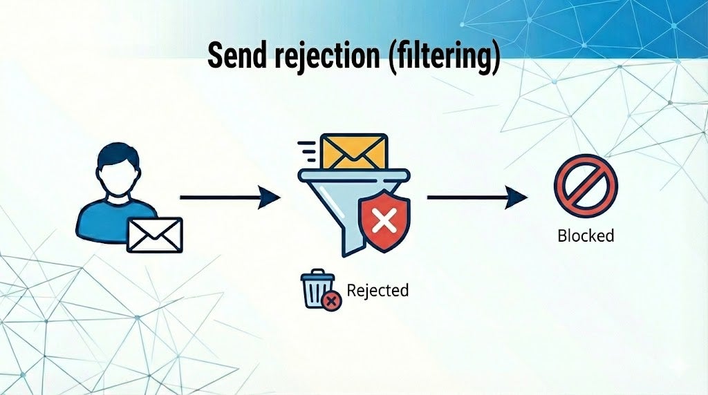 システムは、個人アドレス(Gmail、Yahoo)への送信や「機密」などの機密キーワードを含むなど、会社の方針に違反するメールを完全にブロックできます。